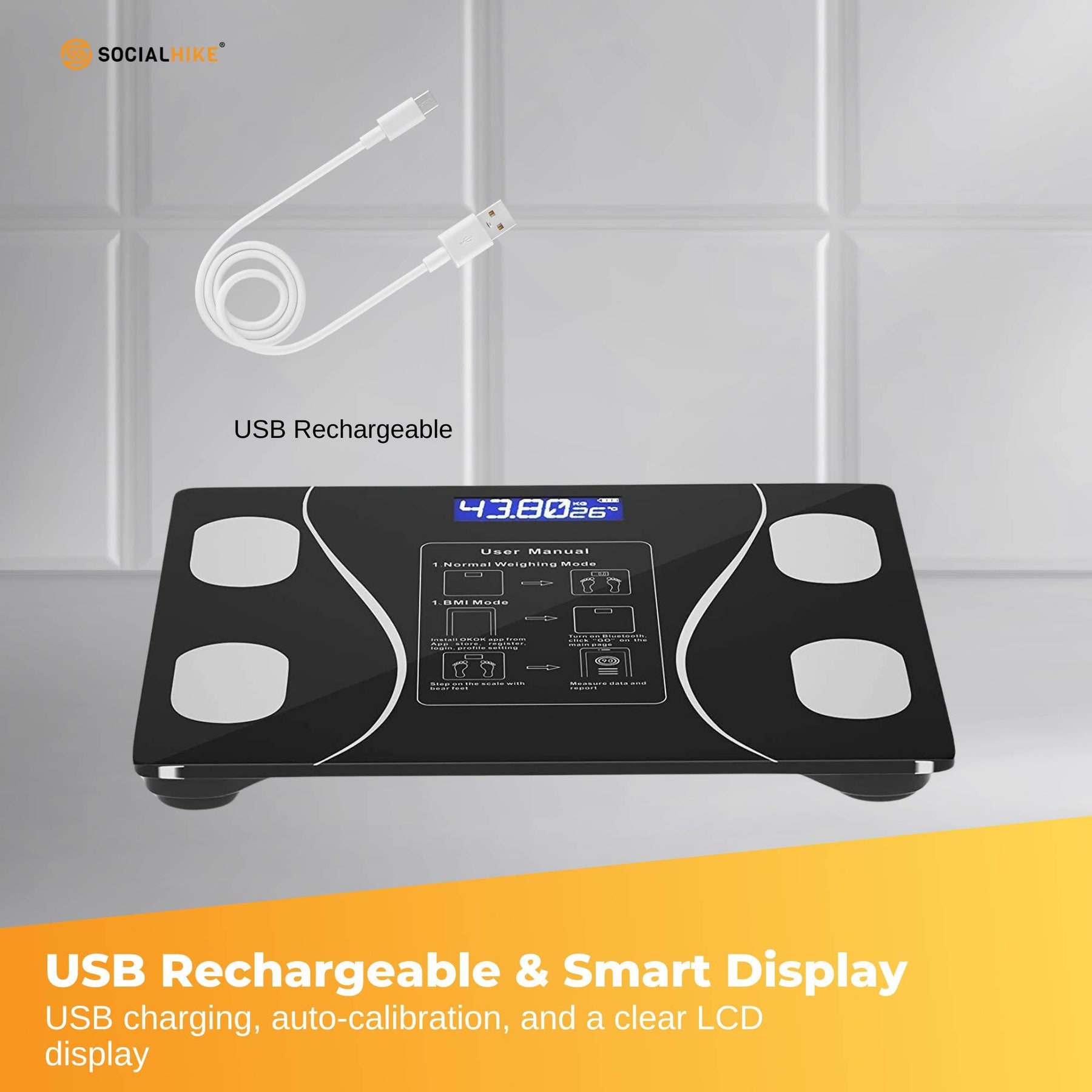 Bluetooth Smart Body Fat Scale Black - Digital BMI Weight USB Recharge with App
