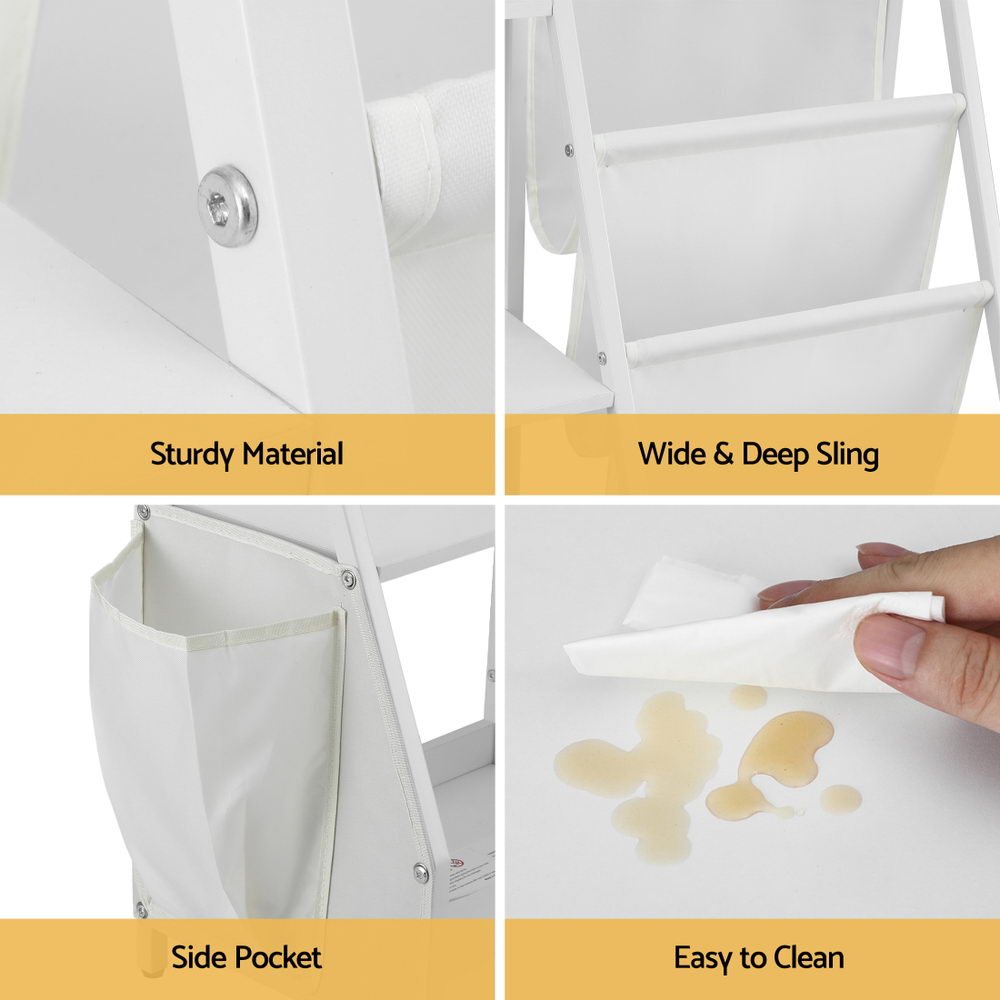 Crafted from water-resistant PB melamine with a sturdy metal frame, this white bookshelf wipes clean easily and withstands daily use. The added fabric pocket offers extra storage for small items. Measuring 75H �� 30W �� 83D cm and suitable for ages 3+, it helps develop tidying habits while fitting perfectly in bedrooms or playrooms. Simple assembly required with all hardware included.