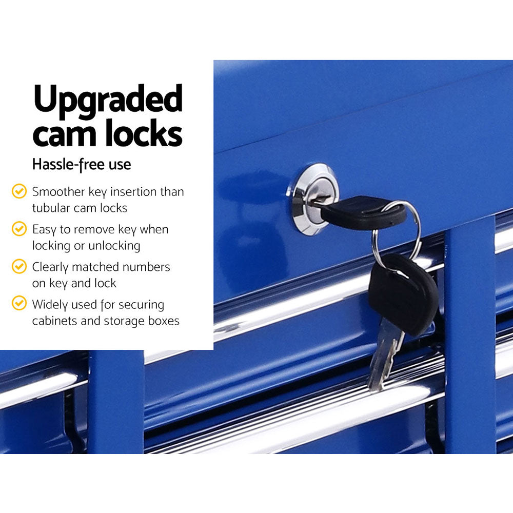 This robust, multi-drawer Giantz Tool Trolley is an essential for any workshop. Crafted from durable steel, it features smooth ball-bearing slides for easy access and a secure lock system for safety. Its spacious design includes varying drawer sizes to accommodate tools of all shapes, complete with non-slip liners. The chest is also mounted on omni-directional castors with locakble front wheels, ensuring a smooth maneuverability and stable positioning. Sleek and functional, it's perfect for organizing and protecting your valuable tools.
